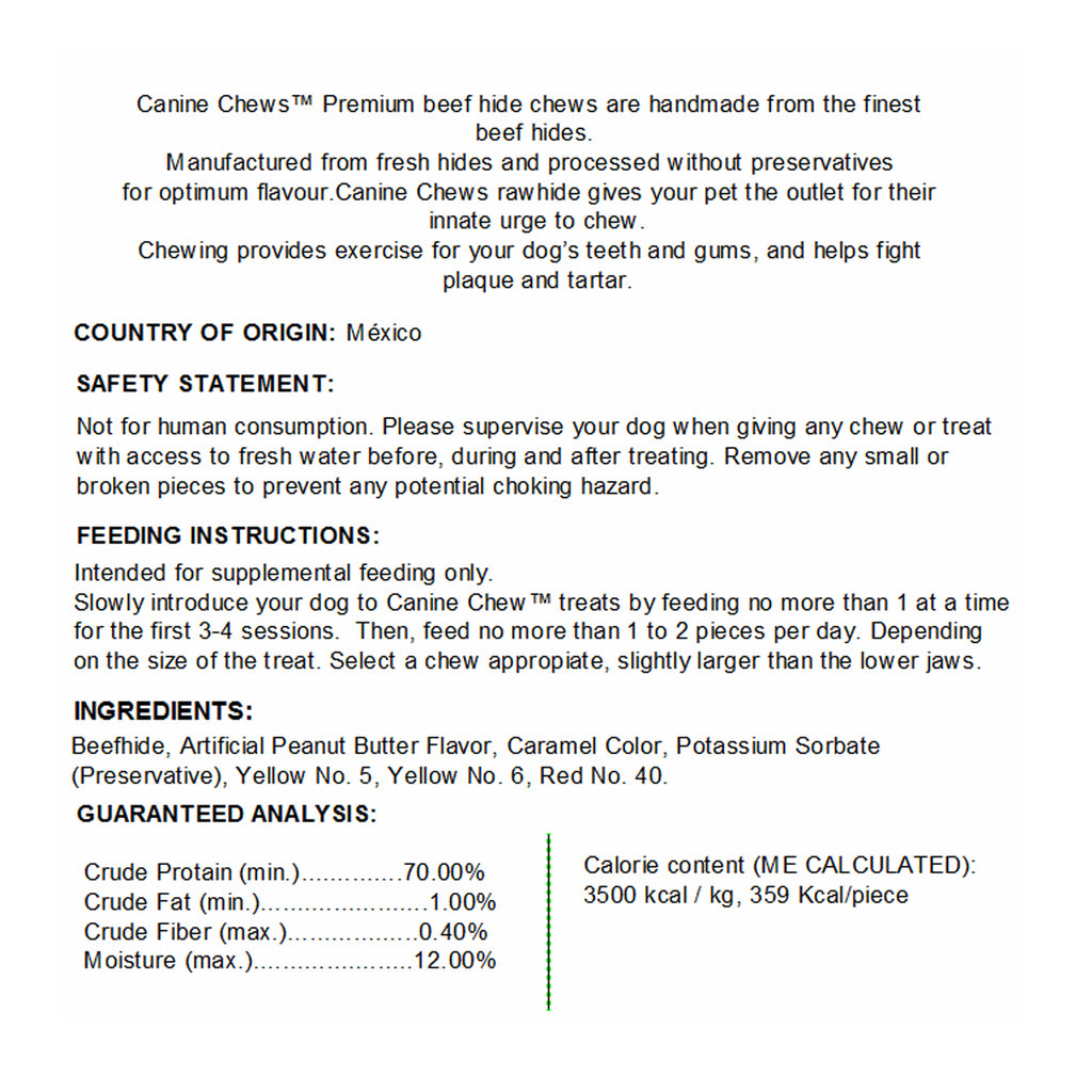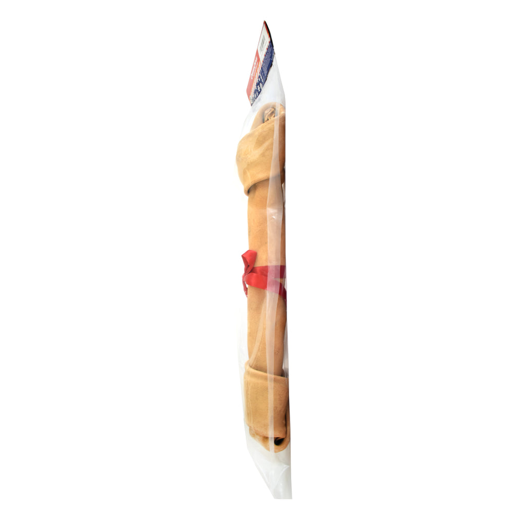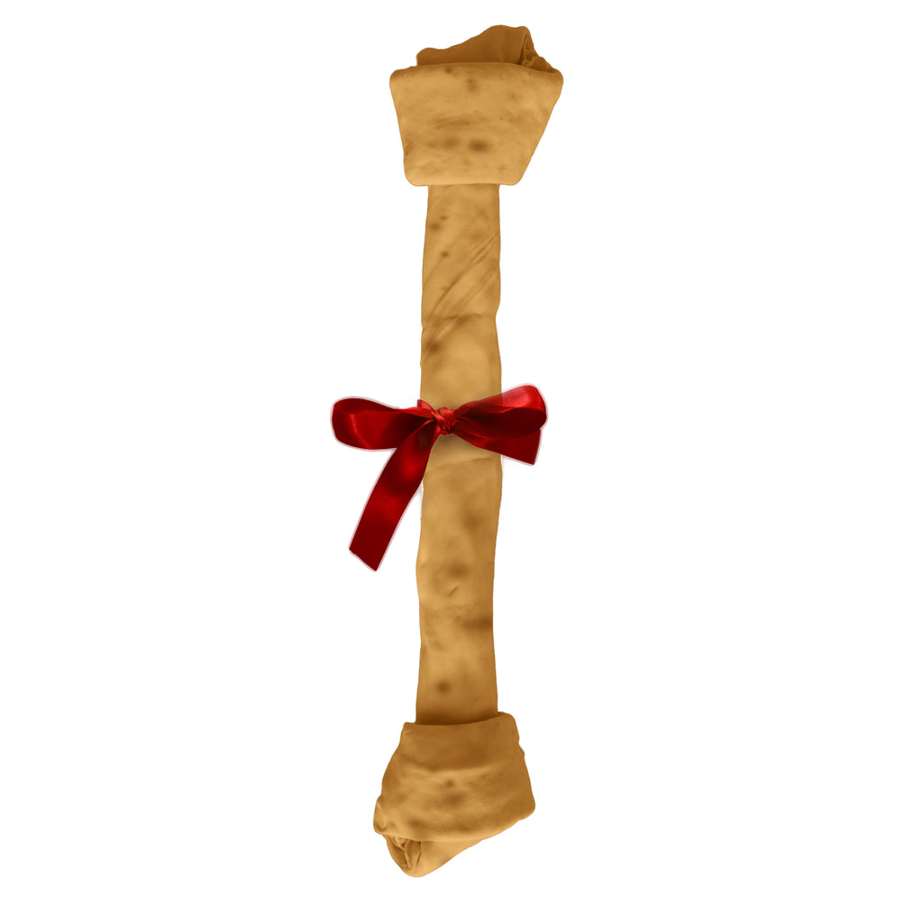 PERFECT LARGE DOG HOLIDAY GIFT! Canine Chews holiday rawhide bones are the perfect treat for your large aggressive chewing dog during the holidays. This GIANT 20-23" dog bone with red holiday bow is the perfect gift for your dog! Canine Chews Super Long Lasting Rawhide Bone for Aggressive Chewing Dogs with Savory Real Beef will satisfy your aggressive chewer's natural urge to chew. Made from 100% beef hide, these natural dog chews have a great real meat taste your dog will love! Benefits include extra thick for aggressive chewers, occupational chewing, dental health, packed with tasty flavor and NEVER FROM CHINA. Dental benefits abound: long-lasting bones clean teeth and support healthy gums by reducing plaque and tartar through a chewing action. Dental health is a primary focal point for vets with regular treating of occupational chews helping maintain teeth for a long and health life. Ideal for aggressive chewing dogs, our large thick rawhide knotted bones provide hours of occupational chewing. With incredible value per piece, this giant dog bone will last one month! Canine Chews is preservative-free and manufactured with all natural materials, keeping your dog healthy and happy. Odor free and will not stain carpets. Packed with real meat flavor your dog will drool over! Our rawhide bones are single-ingredient all natural rolls made from real beef hide. The savory beef flavor basting will be sure to keep your dog's attention for hours of chewing fun. Canine Chews rawhide is not considered to be a balanced diet and therefore should not be a primary food source for your dog. Rather, rawhide should be a supplemental dog snack fed with 1 per month. With over 25 years of rawhide manufacturing experience, Canine Chews is vertically integrated and has complete control over the full process of rawhide manufacturing from the beef hide through to your dog. Never from China, our rawhide is hand made in our family-owned factory in Mexico.