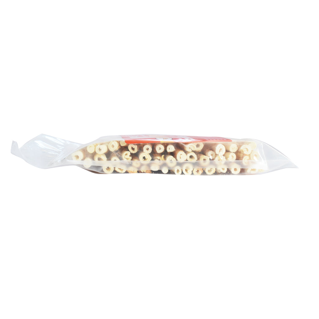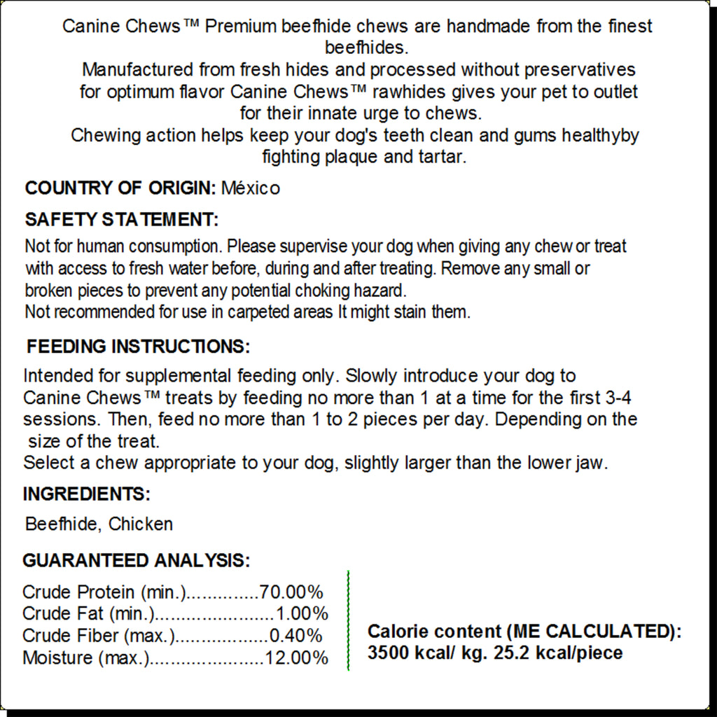 Canine Chews 5 inch chicken-wrapped chew toy twist sticks will satisfy your small dog's natural urge to chew or will provide an occupational chew toy for your new puppy. Made from 100% only USA sourced chicken and beef hide, these all natural dog chews have a savory beef and chicken taste your dog will love! Dental benefits abound: long-lasting twist sticks clean teeth and support healthy gums by reducing plaque and tartar through the dog's natural chewing action. Ideal for small dogs and puppies, our 5" chicken wrapped twist sticks combinations are your choice for an occupational chew. NEVER FROM CHINA, our rawhide is hand made in our family-owned factory in Mexico with beef hides from Mexico and the USA and chicken only from USA chicken farms. With over 25 years of proudly serving the USA market, our highly certified factory is completely focused on creating the BEST rawhide dog treats for you and your pup! Our most popular small dog chew, the chicken wrapped twist stick is a fun and playful chew toy for your small dog to gnaw. With natural ingredients, no risks of staining carpets or furniture both you and your pup will enjoy these yummy dog treats!
