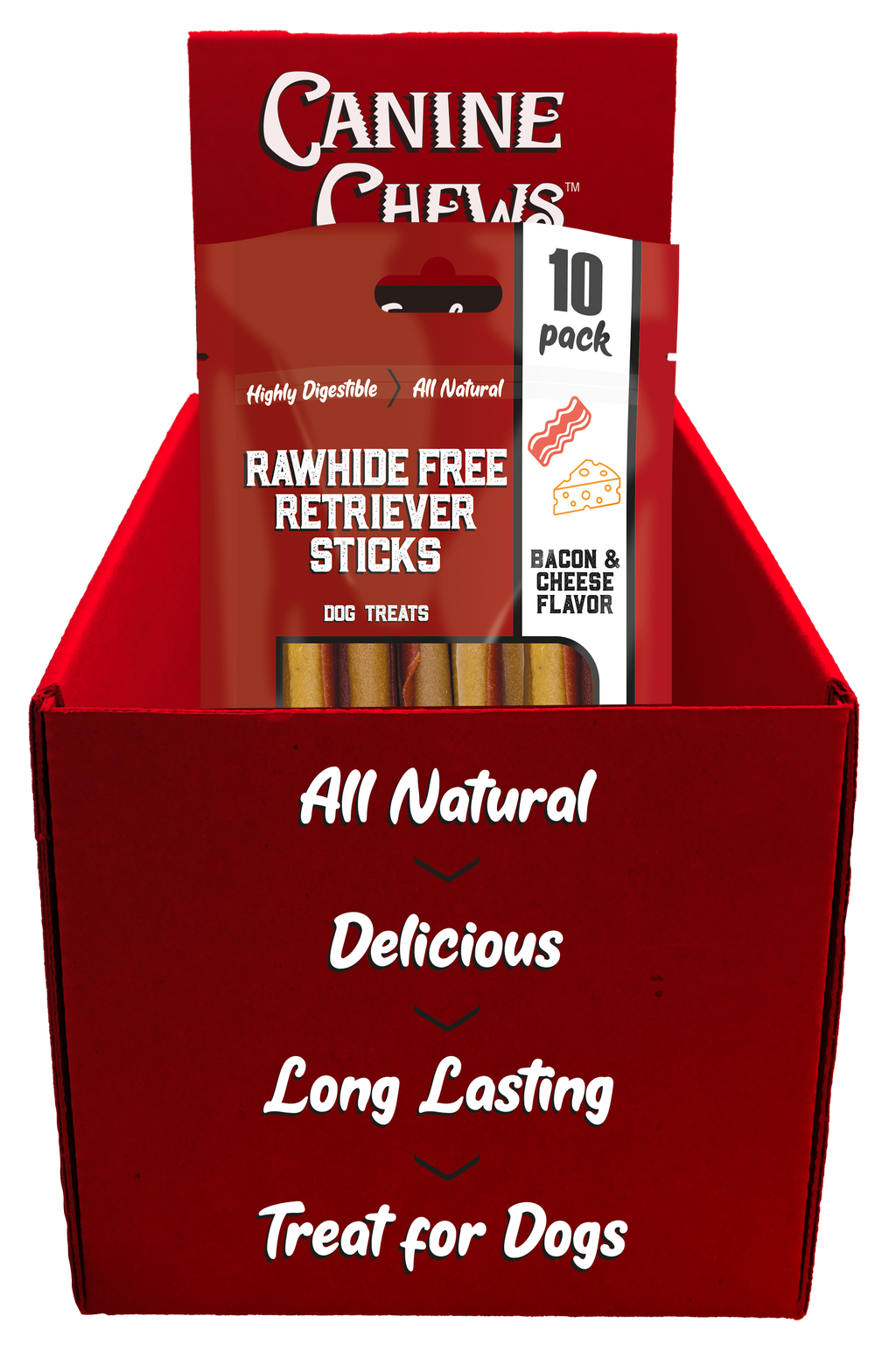 The Canine Chews Rawhide-Free Mini PDQ is the perfect shelf or register display for customers looking for safe, long-lasting chews without rawhide. Featuring bacon & cheese-flavored retriever sticks, these highly digestible treats are a sure hit!