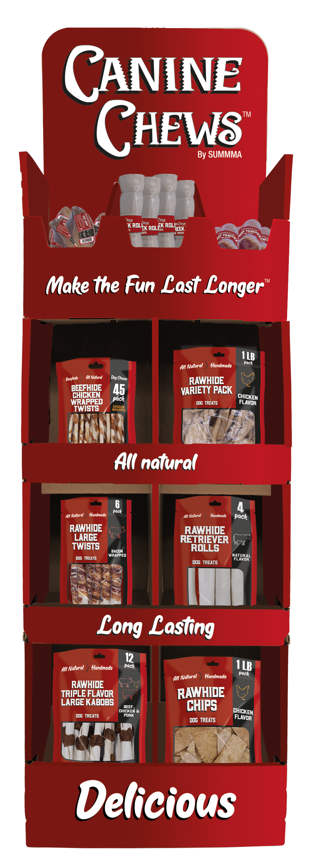 Treat dogs to the best of both worlds with our Canine Chews Rawhide & Natural Chews Floor Display. Featuring a carefully selected mix of long-lasting natural chews like beef cheek and trachea, as well as flavor-packed rawhide treats, this display is a must-have for pet stores and specialty retailers.